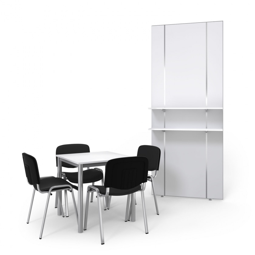Möbelpaket C: 1x Tisch 70 x 70 cm (Platte weiß); 4x Polsterstuhl Standard (schwarz); 2x Regalbord, 30 cm, gerade (montiert an Standwand).