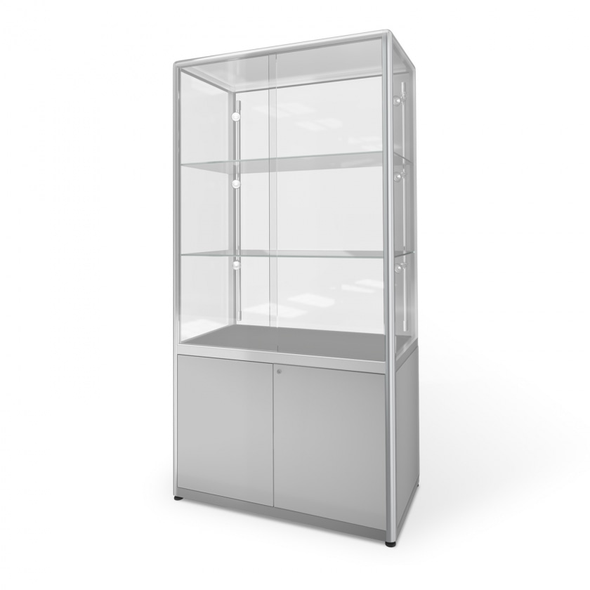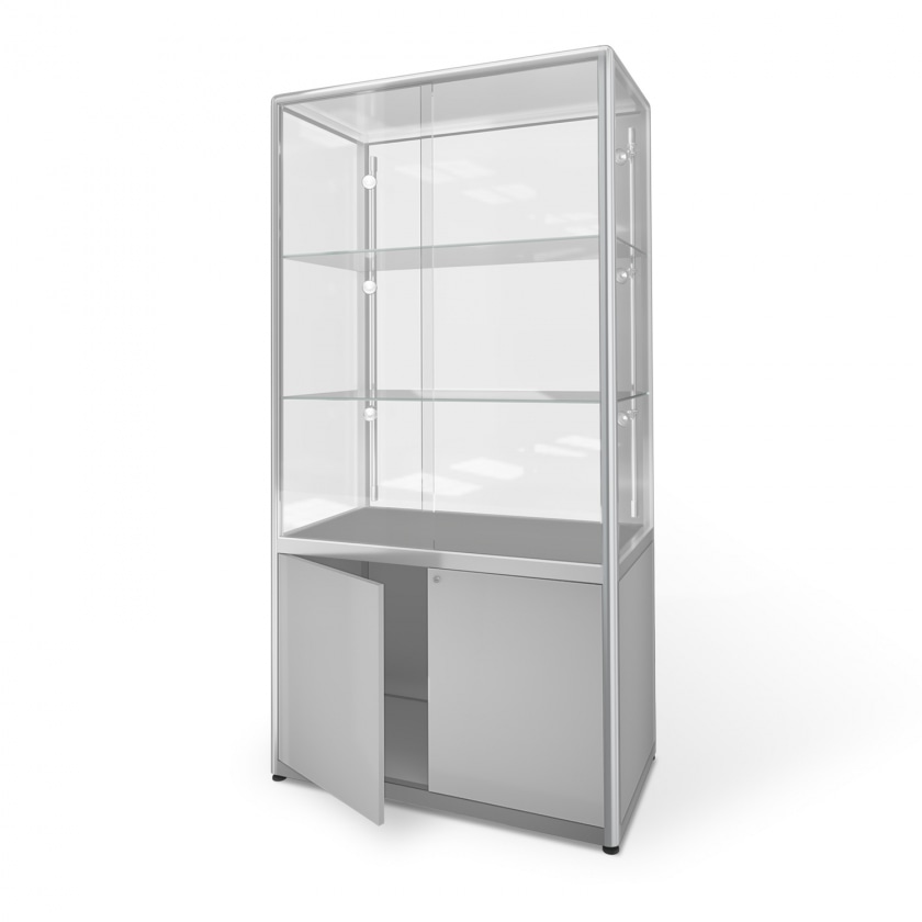 Rahmen: Aluminium, Farbe Unterbau: lichtgrau, Glasaufsatz (klar) mit Schiebetüren, Glas- und Korpustüren abschließbar, Beleuchtung mit LED.