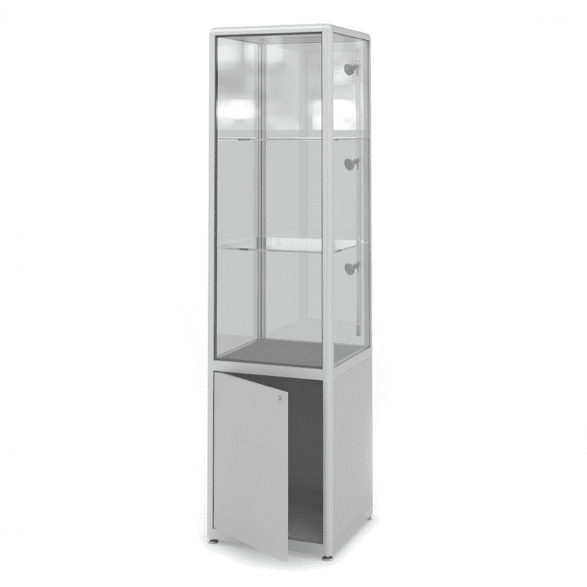 Korpus: System New Line Octanorm in Alu natur, Füllung KS (Stärke: 19 mm, Farbe: grau), Beleuchtung mit Niedervoltstrahler Apollo-System, zwei Glaseinlegeböden, Glas- und Korpustür abschließbar.