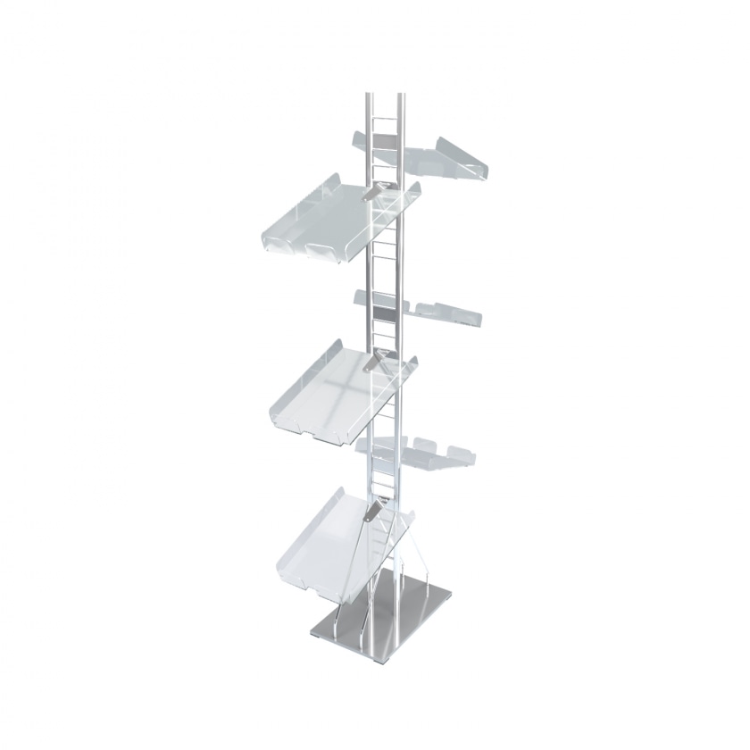 Gestell aus Edelstahl mit 6 höhenverstellbaren Plexiglas-Ablagen im A4-Format.