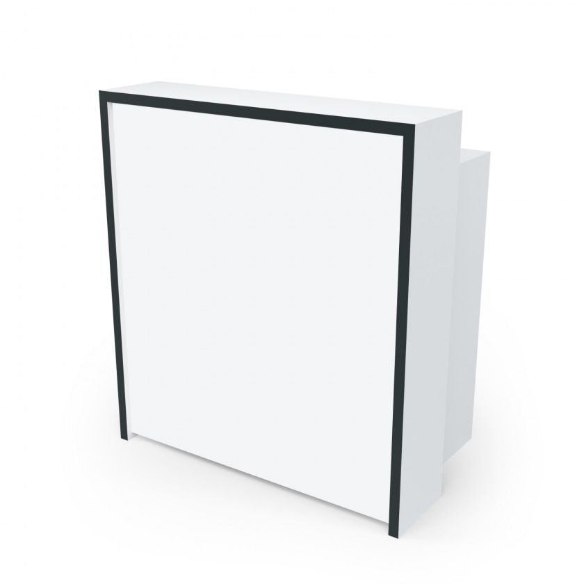 Korpus aus Holz (Stärke 28 mm). Flächen weiß. Kante an der Front schwarz. Füllfläche der Front aus Plexiglas.