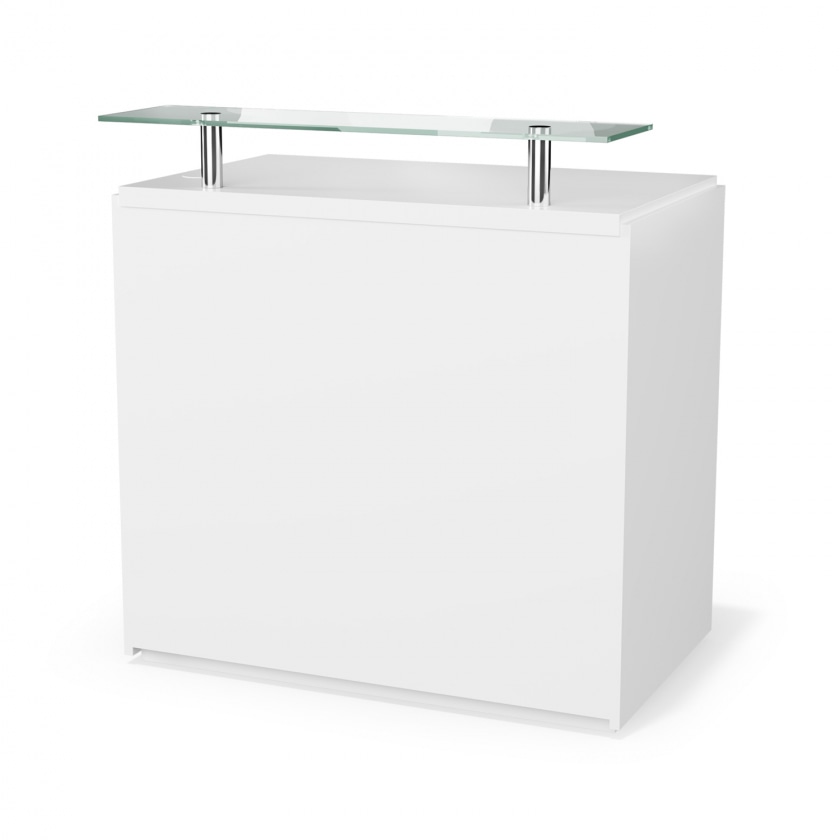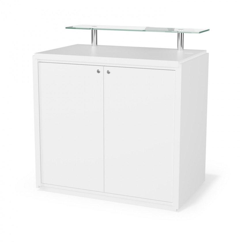 Korpus: KS (Stärke: 19 mm), Farbe: Weiß, mit aufgesetzter Arbeitsplatte KS (Stärke: 38 mm), Sockel (schwarz, Höhe: 38 mm), Baraufsatz aus Klarglas (Höhe: 10 mm), auf Edelstahlrohr montiert, pro Element zwei Einlegeböden, mit Türen, KS Dekor K101, Arbeitshöhe 96,4 cm.