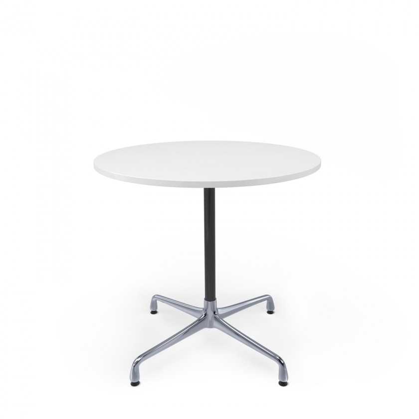 Runde weiße Tischplatte mit Stahlrohr-Gestell.