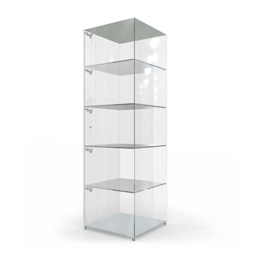 Mit 4 Glastablaren, abschließbarer Drehtür und 5 Leuchtmitteln an der Seite.
