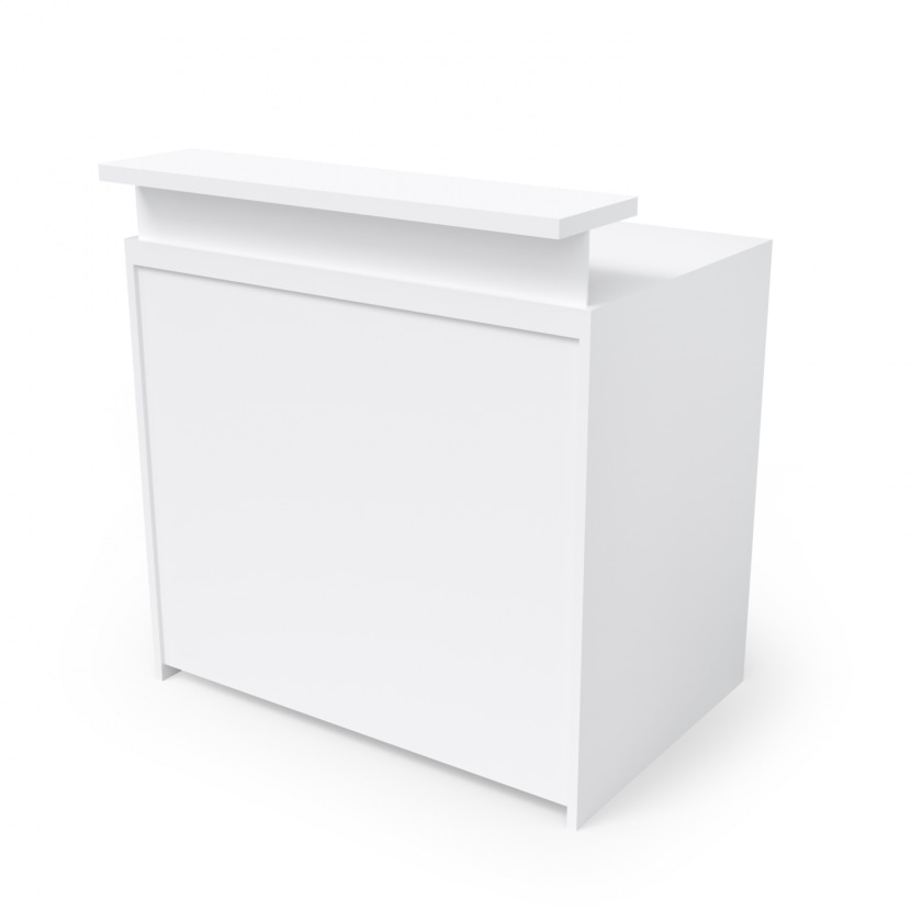 Korpus aus Holz (Stärke: 19 mm), weiß. Mit Einbauprospektschrank und einem Einbautürschrank. Arbeitsplatte und Barplatte weiß (Stärke: 28 mm). Barplatte auf Metallhülsen. Kühlschrankeinbau durch Entfernen der Einbauschränke möglich