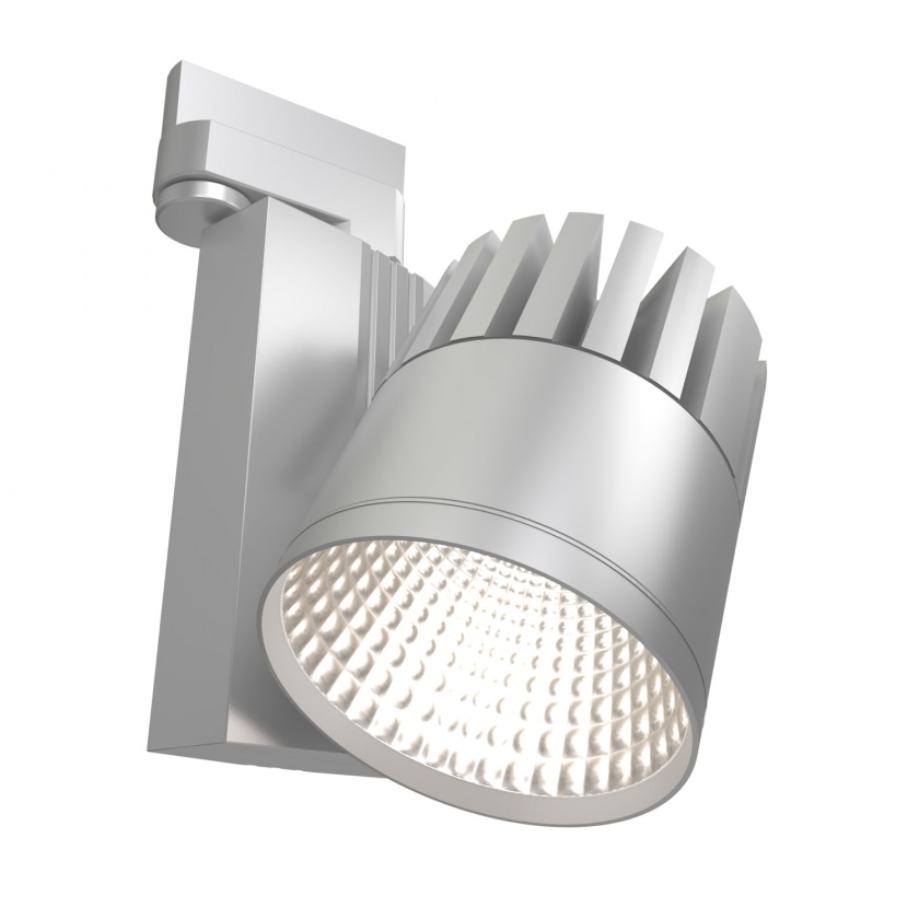 Strahler 40W / 230V. Lichtleistung: 3600 Lumen. Farbtemperatur: ca. 4000K. Befestigung an 3~Stromschiene. Schwenkbar horizontal 330° / vertikal 355°. Begrenzt flächige Beleuchtung, 60° Flood. Empfohlene Entfernung zum Beleuchtungsobjekt: >2 m.